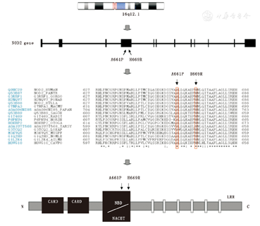 对于新发现的错义突变,通过Polyphen2、SIFT和Clinvar在线推测其致病性;通过多物种NOD2蛋白同源序列比对和突变蛋白的空间构象预测,分析NOD2突变蛋白的功能变化。