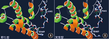 注:A:野生型;B:突变型;绿色虚线表示氢键,连接2个氨基酸,粉色虚线代表新形成的氢键(白色箭头所示) A:wild type;B:mutant type;The green dotted line represents the hydrogen bond and the pink dotted line represents the newly formed hydrogen bond (white arrow indicated)