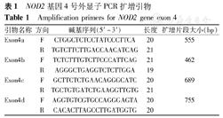 从患儿及其家系成员的外周静脉抗凝血中提取基因组,PCR扩增NOD2基因4号外显子(表1),扩增产物经切胶回收,送上海生工进行Sanger测序。患儿及其父母的另一份外周血样品直接送北京迈基诺医学检验所进行医学外显子检测(高通量测序)。