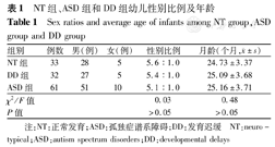 注:NT:正常发育;ASD:孤独症谱系障碍;DD:发育迟缓 NT:neuro-typical;ASD:autism spectrum disorders;DD:developmental delays