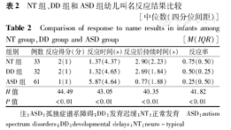 NT组、DD组和ASD组幼儿叫名反应结果比较[中位数(四分位间距)]