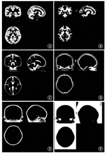 注:A:灰质;B:白质;C:脑脊液;D:背景1;E:背景2;F:背景3 A: gray matter;B:white matter;C:cerebrospinal fluid;D:background 1;E:background 2;F:background 3