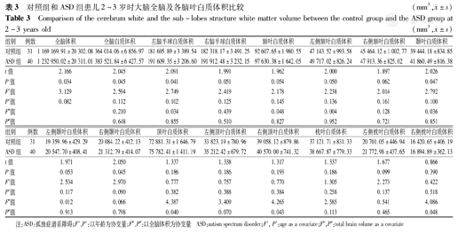 Comparison of the cerebrum white and the sub-lobes structure white matter volume between the control group and the ASD group at 2-3 years old(mm3,