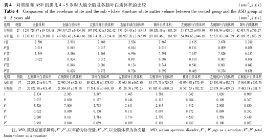 对照组和ASD组患儿4~5岁时大脑全脑及各脑叶白质体积的比较(mm3,