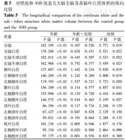 对照组与ASD组相比,不同年龄全脑、双侧脑半球、额叶、双侧额叶、颞叶、双侧颞叶、顶叶、双侧顶叶、枕叶、双侧枕叶的白质体积比较,差异均有统计学意义(均P<0.01);年龄和组别无显著的交互效应,说明年龄因素的作用不随分组的不同而不同;2组全脑、双侧脑半球、额叶、双侧额叶、颞叶、双侧颞叶的白质体积差异均有统计学意义(均P<0.05)(表5)。