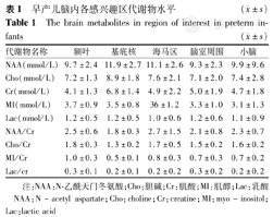 MRS检查早产儿脑内各感兴趣区代谢物,结果见表1。