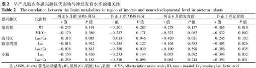 额叶代谢物与神经发育水平进行相关分析显示,差异均无统计学意义(均P>0.05)。基底核MI、MI/Cr与纠正1岁发育商均呈负相关(r=-0.465、-0.532,均P<0.05);海马区Lac/Cr与纠正6月发育商呈负相关(r=-0.420,P<0.05);脑室周围Lac与纠正1岁发育商呈负相关(r=-0.405,P<0.05),脑室周围Lac/Cr与纠正1岁AIMS得分呈负相关(r=-0.380,P<0.05),脑室周围Lac/Cr与纠正1岁发育商呈负相关(r=-0.386,P<0.05);小脑Lac、Lac/Cr与纠正1岁发育商呈负相关(r=-0.393、-0.394,均P<0.05)。结果见表2。
