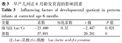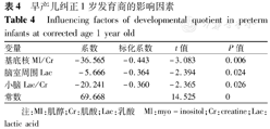 将有统计学意义的变量作为自变量,神经发育水平作为因变量进行多因素线性回归分析,结果显示:早产儿纠正6月龄发育商的影响因素是海马区Lac/Cr,结果见表3;早产儿纠正1岁发育商的影响因素是基底核MI/Cr、脑室周围Lac、小脑Lac/Cr,结果见表4。