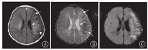患儿均行头颅MRI+DWI检查,未行磁共振血管成像(MRA)检查。头颅MRI显示缺血性脑梗死病灶部位为多发斑片状或不规则大片状异常信号,呈长T1及长T2信号,DWI均呈高信号(图1),出血表现为短T1信号,位于梗死区内。7例为出血性脑梗死(17.90%),32例为缺血性脑梗死(82.10%)。