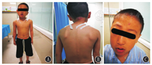 患儿,男,7岁5个月。患儿自幼右眼斜视,斜视角:角膜映光法:右眼偏斜角度为10°;2个月开始反复皮肤湿疹;1岁头面部反复米粒样红斑、丘疹、脓疱,瘙痒明显,部分破溃后出现糜烂、渗出,外院抗感染治疗症状可好转,但易反复;2岁因"细菌性肠穿孔"于外院行梅克尔憩室切除术;4岁5个月因"头面部反复红斑、脓疱3年余,加重3 d"至郑州大学第一附属医院皮肤科就诊。其他症状:眼距增宽,右眼眼球凸出,高腭弓。血常规示白细胞11.3×109/L、血红蛋白109 g/L、血小板342×109/L、中性粒细胞计数6.7×109/L、嗜酸性粒细胞计数0.77×109/L。免疫球蛋白补体测定示IgA 0.61 g/L、IgG 9.65 g/L、IgM 0.99 g/L、IgE 2.5×106 IU/L、C3 1.34 g/L、C4 0.269 g/L;淋巴细胞亚群检测示T淋巴细胞0.67、辅助性T淋巴细胞0.37、抑制性T淋巴细胞0.23、B淋巴细胞0.24、自然杀伤细胞(NK细胞)0.08、辅助/抑制淋巴细胞1.62。电解质、肝肾功、尿常规等均正常。胸部CT:双肺透亮度可,纹理清晰,两上肺见絮状稍高密度影。头颅磁共振成像(MRI):左侧额叶点状异常信号,考虑白质脱髓鞘,双侧颞角稍大,双侧脑室增宽。予抗感染治疗,症状好转,出院后症状反复,间断自行口服抗生素治疗。7岁反复出现颈部淋巴结冷脓肿,其他表现有脊柱侧弯、面部不对称、眼距增宽、高颚弓(图1);血常规:白细胞6.5×109/L、血红蛋白113 g/L、血小板317×109/L、中性粒细胞计数2.18×109/L、嗜酸性粒细胞计数0.68×109/L;免疫球蛋白补体测定:IgA 0.7 g/L、IgG 11.68 g/L、IgM 1.66 g/L、IgE 25.92×106 IU/L、C3 1.36 g/L、C4 0.11 g/L;脓肿穿刺行细菌培养提示金黄色葡萄球菌感染;彩超:左侧颈部混合型包块(58 mm×62 mm)。CT:左侧颈部间隙软组织占位并周围增大淋巴结,考虑炎性包块可能,双侧颈动脉鞘内增多小淋巴结。颈部脓肿病理:淋巴结反应性增生,局灶性化脓性炎;免疫组织化学:角蛋白单克隆抗体AE1/AE3(CK)(-)、CD3+CD20(灶+)、B淋巴细胞活化特异性蛋白(PAX-5) (灶+)、CD10(生发中心+)、CD21(淋巴滤泡树突细胞+)、CD30(散在+)、增殖细胞核抗原(Ki-67) (约40%+)、骨髓瘤相关基因MUM-1(+)。心电图:左心室高电压;脊柱立位、侧位片:脊柱以胸8椎体为中心轻度侧弯(图2)。行颈部脓肿清创手术及抗感染治疗,患儿症状好转。