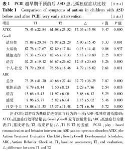 注:PCBI:以游戏为基础促进交流与行为的干预;ASD:孤独症谱系障碍;ATEC:孤独症疗效评估量表;Gesell:Gesell发育诊断量表;ABC:孤独症行为量表;T1:基线评估;T2:结束评估;△:T1和T2的差值 PCBI :play-based communication and behavior intervention;ASD:autism spectrum disorder;ATEC:the Autism Treatment Evaluation Checklist;Gesell:Gesell Developmental Schedules;ABC:Autism Behavior Checklist;T1:baseline assessment;T2:end evaluation;△:difference between T1 and T2
