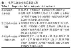 KD治疗前需要对患儿进行全面性的评估,包括对患者营养状态的评估、吞咽功能评估、癫痫发作类型及严重程度的判断、病因的分析、绝对或相对禁忌证的识别、并发症发生风险的预估,并完善相应的实验室检查。需要了解患儿及家属的期望值、配合度和心理状态,与其做一个良好的沟通,以达到KD治疗的良好依从性、最佳效果,并且避免严重不良反应的出现。同时,需要指导患儿监护人学习KD相关知识,了解AEDs和其他常用药物的含糖量,熟悉常见不良反应的处理等(表1)。