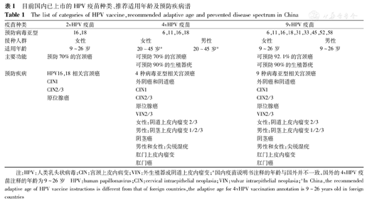 注:HPV:人类乳头状病毒;CIN:宫颈上皮内病变;VIN:外生殖器或阴道上皮内瘤变;a国内疫苗说明书注释的年龄与国外并不一致,国外的4vHPV疫苗注释的年龄为9~26岁 HPV:human papillomavirus;CIN:cervical intraepithelial neoplasia;VIN:vulvar intraepithelial neoplasia;aIn China,the recommended adaptive age of HPV vaccine instructions is different from that of foreign countries,the adaptive age for 4vHPV vaccination annotation is 9-26 years old in foreign countries