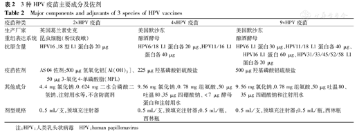 HPV疫苗种类是根据疫苗组成中所包含的病毒株数量而定,如含HPV16和HPV18亚株,称为2价HPV疫苗(2vHPV疫苗)等。不同种类疫苗与推荐接种年龄段以及所预防的疾病谱各不相同(表1);同时不同种类疫苗生产技术、抗原含量、佐剂和其他成分也略有差异(表2)。