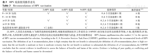 注:HPV:人类乳头状病毒;√为推荐选择的疫苗种类;根据美国预防医学工作委员会(USPSTF)的分级方法作出的推荐等级;A级:强烈推荐;B级:推荐;I级:儿科医师与受种儿童监护人共同讨论决定疫苗接种的风险与获益,并作出接种决定 HPV:human papillomavirus;this marker(√)is the species of HPV vaccine recommended for selection.According to the U.S.Preventive Services Task Force(USPSTF) guidelines to determine the recommended levels of HPV vaccination.The definition of an A recommendation,there is high certainty that the net benefit is substantial;the definition of a B recommendation,there is high certainty that the net benefit is moderate or there is moderate certainty that the net benefit is moderate to substantial;the definition of a I recommendation,the USPSTF concludes that the current evidence is insufficient to assess the balance of benefits and harms of the service.Evidence is lacking,of poor quality,or conflicting,and the balance of benefits and harms cannot be determined