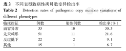本研究结果显示,先天畸形是最常见的CMA检测原因,其次是面容异常,CMA异常检出率分别为30.3%和21.6%。这表明,具有这些表型的新生儿有较高的可能性存在染色体异常。对于临床症状不典型,仅表现有反应低下、肌张力低、治疗困难的病例,CMA检出率低于面容异常及先天畸形组,但仍存在较高的阳性率,因此临床医师应警惕这类患儿染色体异常的可能。
