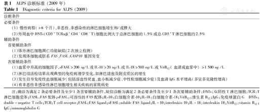 2009年,美国国立卫生研究院(National Institutes of Health,NIH)继1999年推荐的ALPS诊断标准后对ALPS及其相关疾病的诊断标准进行了修订(表1)[36]和探讨[37]。