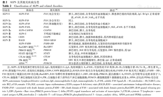 结合2009年的分型、2017国际免疫协会(International Union of Immunological Societies,IUIS)的分类[38]及近年来发现的新基因,现将ALPS和ALPS样相关疾病分型见表2。