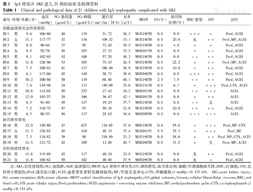 IgA肾病并AKI患儿21例的临床及病理资料