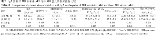 MH:macrosco-pic hematuria;AKI:acute kidney injury;ALB:serum albumin;NAG:N-acetyl-β-D-glucosaminidase;β2-MG:β2-microglobulin;aFisher′s exact test