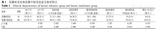 乳糖耐受组和乳糖不耐受组患儿临床特点