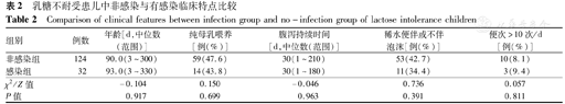 Comparison of clinical features between infection group and no-infection group of lactose intolerance children