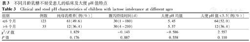 乳糖不耐受组中,其中≤6个月患儿123例,>6个月患儿33例;≤6个月患儿纯母乳喂养率、腹泻持续时间、大便pH值与>6个月比较差异均无统计学意义(均P>0.05),结果见表3。