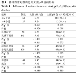 | 组别 | 例数 | 纯母乳喂养[例(%)] | 腹泻持续时间(d) | 大便pH均值 | 大便pH值<5.5[例(%)] |