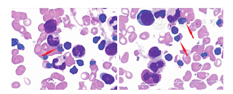 外院磁共振成像(MRI):右胫骨中下段、左胫骨全程髓腔内异常强化信号。入院:白细胞21.24×109/L,中性粒细胞0.125,淋巴细胞0.799,血红蛋白(Hb)81 g/L,血小板733×109/L,红细胞平均体积62.1 fL,红细胞平均血红蛋白水平18.7 pg,红细胞平均血红蛋白水平301 g/L,网织红细胞0.012 5。红细胞沉降率(ESR)81 mm/1 h,C反应蛋白(CRP) 86.3 mg/L,血清淀粉样蛋白A 334.0 mg/L。可溶性白细胞介素(IL)-2受体910.0 U/mL,肿瘤坏死因子-α 14.4 ng/L,IL-6 41.4 ng/L,IL-1β、IL-8、IL-10正常。血细菌培养、真菌抗原、真菌D-葡聚糖阴性。骨髓象(图1):红系增生活跃,晚幼红比值偏高,部分晚幼红可见花瓣核(多核)。B超:肝、脾形态、大小正常。
