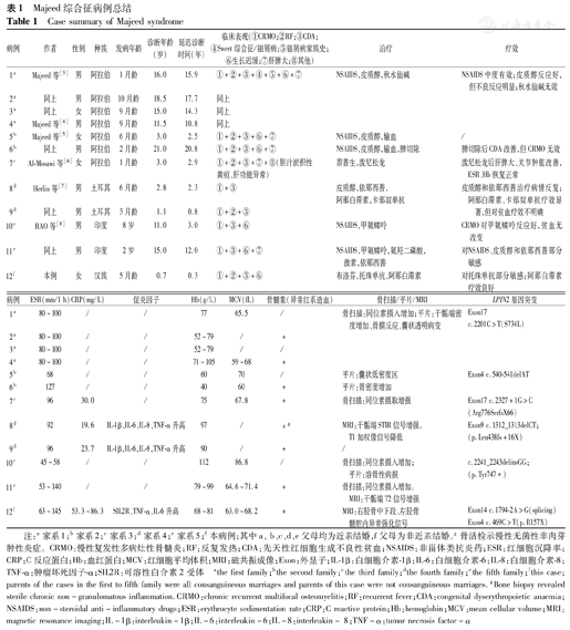 本研究以"Majeed综合征"或"Majeed syndrome"为检索词,对万方数据知识服务平台、维普中文科技期刊数据库、中国期刊全文数据库及PubMed数据库进行检索,国内尚未见报道,对PubMed的报道总结见表1。