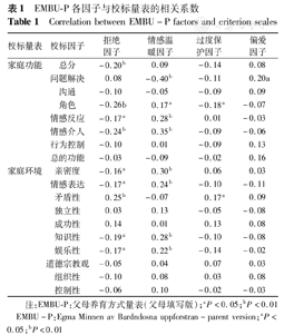 EMBU-P效度:(1)校标效度:由同一养育者填写FES中文版(FES-CV)、FAD中文版作为效标,统计相关系数以评定校标效度。(2)结构效度:对EMBU-P量表四因子模型进行验证性因素分析。