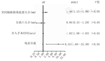 以单因素分析P<0.2为界,进一步将超声心动图测得的VSD基底部大小、分流口大小、介入手术时间、封堵器大小、残余分流排除共线性关系后纳入二元回归模型。结果表明,封堵器大小(OR=1.48;95%CI:1.13~1.90)、残余分流(OR=6.53,95%CI:1.69~25.30)是pmVSD介入术后新发轻度以上三尖瓣反流的危险因素(均P<0.05)(图2)。