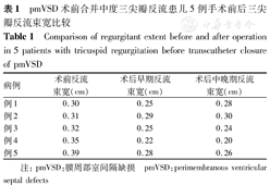 pmVSD术前合并中度三尖瓣反流患儿5例手术前后三尖瓣反流束宽比较