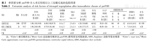单因素分析pmVSD介入术后轻度以上三尖瓣反流的危险因素