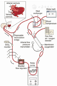 注:arterial cannula:动脉内置管;venous cannula:静脉内置管;SvO2 monitor:静脉血氧饱和度监测;bladder flow regulator:静脉血囊调节装置;roller pump:滚压泵(人工心脏);membrane oxygenator:膜式氧合器(人工肺);gas flow:气体入口;heat exchanger:热交换器;water bath:水箱