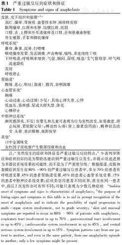 注:a突然发生的症状和体征是严重过敏反应的特点;b本表列举体征和症状的目的是为帮助迅速识别严重过敏反应发生,并提示迅速进展为多器官系统受累的可能性,而不是为了严重度分级;c根据报道,皮肤和黏膜症状发生在80%~90%的严重过敏反应患者中,多至70%的患者有呼吸道受累、45%的患者胃肠道受累、45%的患者心血管系统受累、15%的患者中枢神经系统受累;症状类型因患者不同而异,甚至在同一患者中,前后2次发作亦可有所不同;可能只表现为少数几种症状 aSudden onset of symptoms and signs is characteristic of anaphylaxis; bthe purpose of listing signs and symptoms in this table is to aid in prompt recognition of the onset of anaphylaxis and to indicate the possibility of rapid progression to multi-organ system involvement, not to grade severity; cskin and mucosal symptoms are reported to occur in 80%-90% of patients with anaphylaxis, respiratory tract involvement in up to 70%, gastrointestinal tract involvement in up to 45%, cardiovascular system involvement in up to 45%, and central nervous system involvement in up to 15%. Symptom patterns vary from one patient to another, and even in the same patient, from one anaphylactic episode to another; only a few symptoms might be present