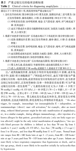 严重过敏反应有时难以诊断,如患有视力或听力受损、神经系统疾病、精神疾病如抑郁、滥用药物、自闭症、注意缺陷多动障碍或认知障碍等疾病者,有可能对严重过敏反应的触发物和症状意识减弱[48]。在任何年龄段,同时服用中枢神经系统药物,如镇静剂、催眠药、抗抑郁药和一代抗组胺药均可能干扰严重过敏反应触发物和症状的识别,亦可干扰描述症状的能力。应注意儿童严重过敏反应的特殊性。发生在婴儿的严重过敏反应有时难以识别,婴儿不会描述症状,且严重过敏反应的某些体征亦可为婴儿的日常表现,如哭闹后面红和发声困难、喂养后反流和便失禁。健康婴儿相较年龄较大儿童和成人血压更低,静息心率更快,因此,应采用适宜年龄的标准判定低血压和心动过速[12](表1)。