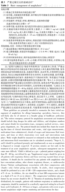 注:a适用于过敏反应/免疫专科医师及广泛的医务工作者。b严重过敏反应评估和治疗的书面急救方案应包括成人和儿童的药物剂量、复苏团队的电话号码和联系信息、急救医疗服务、急诊科等;方案同样应包括流程表,用以记录临床观察和事件发生的时间、生命体征测量、给药剂量、给氧和静脉液体治疗细节、观察和给予干预的时间等。c体质量应予测量或估算,以便对药物剂量和静脉液体复苏准确计算。d第4、5、6步应在诊断或强烈怀疑严重过敏反应的同时立即采用,如果急性严重过敏反应发作早期的数分钟宝贵治疗时间错失,后续管理会更加困难。e儿童定义为青春期前体质量在35~40 kg的患者,而非以年龄定义;f辅助给氧应用于伴呼吸窘迫和接受多次剂量肾上腺素给药的所有患者,在同时患有哮喘、其他慢性呼吸系统疾病或心血管疾病而发生严重过敏反应的患者中同样应考虑应用。g以胸外按压开始心肺复苏,而后给予人工呼吸。儿童按压频率至少100次/min,按压深度5 cm(婴儿4 cm),单人复苏按压/通气比为30∶2。h监测持续时长应个体化,如伴中度呼吸或心血管系统受累的患者应在医疗机构至少监测4 h,如有指征,应监测8~10 h或更长,患重度严重过敏反应或症状迁延的患者,可能需要持续数日的监测和干预 aThese guidelines are primarily intended to summarize the basic initial ma-nagement of anaphylaxis for allergy/immunology specialists; however, they will likely also be of interest to a broader group of healthcare professionals.bThe written emergency protocol for anaphylaxis assessment and treatment should include drug dosages for adults and children, and telephone numbers and contact details for resuscitation team, emergency medical services, emergency department, etc. The protocol should also include flow charts for recording the times of clinical observations and events, vital signs measurements, medications/doses administered, details of oxygen and intravenous fluid treatment, and times at which observations were made and interventions took place.cBody weight should be measured or estimated so that medication doses and intravenous fluid resuscitation can be calculated accurately.dSteps 4, 5, and 6 should be performed promptly and simultaneously as soon as anaphylaxis is diagnosed or strongly suspected. If precious minutes are lost early in the treatment of an acute anaphylactic episode, subsequent management can become more difficult.eChild is defined as a pre-pubertal patient weighing less than 35-40 kg, not defined by age.fSupplemental oxygen should be given to all patients with respiratory distress and those receiving repeated doses of epinephrine. It should also be considered for any patients with anaphylaxis who have concomitant asthma, other chronic respiratory disease, or cardiovascular disease.gInitiate cardiopulmonary resuscitation with chest compressions only (hands-only) before giving rescue breaths. In adults, chest compressions should be performed at a rate of 100-120 compressions/minute, and a depth of 5-6 cm. In children, the rate should be at least 100 compressions/minute at a depth of 5 cm (4 cm in infants). The compression/ventilation ratio performed by one rescuer should be 30∶2.hDuration of monitoring should be individualized; for example, patients with moderate respiratory or cardiovascular compromise should be monitored in a medically supervised setting for at least 4 hours and if indicated, 8-10 hours or longer, and patients with severe or protracted anaphylaxis might require monitoring and interventions for days