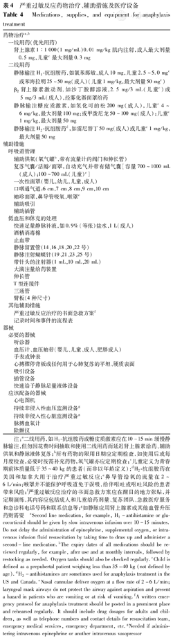 注:a二线用药,如H1-抗组胺药或糖皮质激素应在10~15 min缓慢静脉输注,但勿因花费时间抽取和使用二线用药而延迟肾上腺素给药、辅助供氧和静脉液体复苏;b所有药物的限用日期应定期检查,如使用后或每月度检查,必要时按需补充药物,氧气罐亦应定期检查;c儿童定义为青春期前体质量低于35~40 kg的患者(而非以年龄定义);dH2-抗组胺药在美国和加拿大用于治疗严重过敏反应;e鼻导管给氧的流量在2~6 L/min;喉罩并不能保护呼吸道免于误吸,给伴呕吐或呕吐风险的患者带来风险;f严重过敏反应治疗的书面急救方案应在醒目的地方张贴,并定期演练,其内容应包括成人和儿童给药剂量、复苏团队、急救医疗服务和急诊科电话号码和联系信息等;g如静脉应用肾上腺素或其他血管升压药则需要 aSecond line medication, for example, H1-antihistamine or glucocorticoid should be given by slow intravenous infusion over 10-15 minutes. Do not delay the administration of epinephrine, supplemental oxygen, or intravenous infusion fluid resuscitation by taking time to draw up and administer a second-line medication.bThe expiry dates of all medications should be reviewed regularly, for example, after use and at monthly intervals, followed by restocking as needed. Oxygen tanks should also be checked regularly.cChild is defined as a prepubertal patient weighing less than 35-40 kg (not defined by age).dH2-antihistamines are sometimes used for anaphylaxis treatment in the US and Canada.eNasal cannulae deliver oxygen at a flow rate of 2-6 L/min; laryngeal mask airways do not protect the airway against aspiration and present a hazard in patients who are vomiting or at risk of vomiting.fA written emergency protocol for anaphylaxis treatment should be posted in a prominent place and rehearsed regularly. It should include drug dosages for adults and children, as well as telephone numbers and contact details for resuscitation team, emergency medical services, emergency department, etc.gNeeded if administering intravenous epinephrine or another intravenous vasopressor