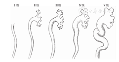 VCUG是目前诊断VUR的金标准。VCUG可较客观和准确显示反流程度,同时可清晰显示膀胱和输尿管形态,还可除外或诊断下尿路梗阻。因为实用且成本较低,而被欧洲、美国和我国等儿科学会共同推荐。目前,临床医师所用的反流分级标准也是根据VCUG的反流表现分为5级(图1),部分存在肾内反流。