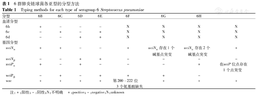 2015年Oliver等[9]对单克隆抗体分型方法无法区分出6A和6C、6B和6D的两类菌株采用气液色谱法进行荚膜多糖检测,发现其中一类菌株具有6A和6C的重复序列,将其命名为6F;另一类菌株具有6B和6D的重复序列,将其命名为6G。基因测序发现,6F型菌株的wciNα488位存在点突变(G→A),导致第150位氨基酸由丙氨酸变成苏氨酸;6G型菌株除了存在上述位点的突变外,在wciNα113位还有新的点突变(G→A),导致第38位氨基酸由天冬氨酸变成了天冬酰胺。