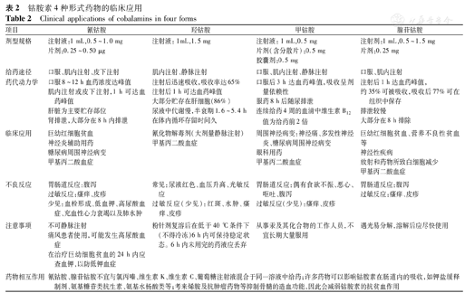目前,4种钴胺素在临床均有应用(表2)。其中氰钴胺和羟钴胺在欧美使用较多,甲钴胺在亚洲地区较为流行,腺苷钴胺的临床应用不多,在我国已被批准。