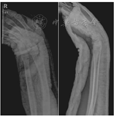 (3)切开复位组:闭合复位尺骨骨折,自尺骨近端打入1枚已预弯弹性髓内针(瑞士Synthes公司生产,直径2.0 mm或2.5 mm)经髓腔穿过骨折线至骨折远端。桡骨骨折采用背侧入路切口,将桡侧腕伸肌肌腱牵向桡侧,拇长伸肌肌腱牵向尺侧。直视下牵拉复位骨折断端,纠正成角、旋转畸形。予4孔或5孔T型接骨板(美国施乐辉公司)固定桡骨远端(图3)。
