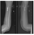 (1)手法复位组:牵引患儿前臂与腕部并旋转骨折远端纠正旋转移位,采用折顶复位纠正前后移位。在C型臂X线机透视下见骨折对位对线良好,予屈腕或背伸腕位肘下短臂前后石膏托外固定(图1)。
