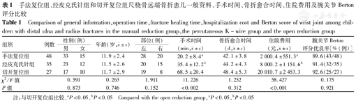3种不同的治疗方法各有优、缺点。本研究结果显示,手法复位组患儿的手术时间及住院费用显著短于经皮克氏针组和切开复位组患者,差异均有统计学意义(均P<0.05),这说明手法复位操作简单,治疗费用低。骨折愈合时间分别为(42.1±3.8) d、(44.2±4.3) d、(48.4±5.3) d,虽然3组患者的骨折愈合时间比较差异无统计学意义(P>0.05),但是从具体数据可以看出切开复位组患儿的骨折愈合时间明显长于手法复位组和经皮克氏针组患儿,考虑主要是内固定增加了手术创伤及破坏了骨折端的血供,从而在一定程度上影响了骨折愈合,这在临床上有一定意义。本研究术后3个月随访时按Berton愈后评价标准评估腕关节功能,优良率分别为89.6%、91.4%、92.6%,这说明3种治疗方式在改善腕关节活动功能上无明显差异。