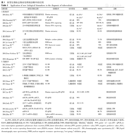 注:POC:床旁;RT-qPCR:反转录定量聚合酶链反应;LTBI:结核潜伏感染;PPV:阳性预测值;NPV:阴性预测值;AUC:受试者工作特征曲线下面积;ELISA:酶联免疫吸附实验;GC-MS:气相色谱质谱;LC-MS:液相色谱质谱;NMR:核磁共振光谱;a测试组;b验证组 POC:point-of-care;RT-qPCR:reverse transcription quantitative polymerase chain reaction;LTBI:latent tuberculosis infection;PPV:positive predictive value;NPV:negative predictive value;AUC:area under the receiver operating characteristic curve;ELISA:enzyme-linked immune sorbent assay;GC-MS:chromatography mass spectrometry;LC-MS:liquid chromatography mass spectrometry;NMR:nuclear magnetic resonance spectroscopy;atest group;bvalidation group
