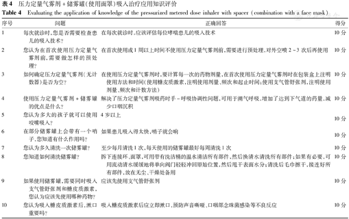 | 4 | 正确吸入体位,正确连接储雾罐和气雾剂 | 儿童保持直立坐位,下颌略向上,将压力定量气雾剂喷嘴插入储雾罐的连接环,压力定量气雾剂储药罐直立向上,储雾罐保持水平位,面罩鼻部位置向上,口鼻部与储雾罐的夹角为90° | 10分 |