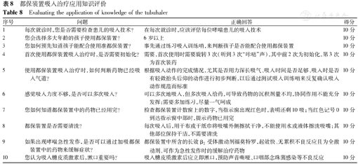 随着儿科医联体建设的深入,儿童哮喘在基层医院长期随访已经逐渐开展,需要加强建设基于儿科医联体的质量控制体系,其中重要的一环就是吸入治疗技术的质量控制,关乎儿童哮喘的整体治疗结局。目前关于儿童哮喘吸入治疗技术的指导细则和质控标准是一个"空白点",虽然儿童哮喘管理可以深入基层,但质量要求并不能松懈,更需要定期在基层进行质控检查。上海市医学会儿科分会呼吸学组和上海儿童医学中心儿科医疗联合体(浦东)专家制定了相关的吸入治疗技术的评价标准,分为"质控督查内容与要求"和"应用知识评价"2个部分,分别对正确的操作步骤和关键的应知应会知识进行考核,对儿童哮喘的常用吸入治疗不同装置:压缩雾化器,pMDI+储雾罐(使用面罩),准纳器和都保装置,分别制定了不同的考核评价标准。在实际质控检查中,可以采用现场质控和网络质控相结合的方法;由于医联体成员单位众多,只要质控要求细化和可操作,网络质控一样可以达到效果,但需要注意质控后的反馈和指导。医联体成员单位的医务人员,所有从事儿童哮喘管理的医师和护士,可以上传不同吸入装置使用的录像,以及通过"问卷星"采集应知应会知识,由医联体核心组专家进行考核和点评,不断提高吸入治疗技术的准确性。采用上传录像进行考核,优点是能节省人力成本和交通成本,集中考核,通过回放不遗漏考核评分点;缺点是对拍摄录像的人员有一定要求,如果拍摄距离、角度不理想,会影响考核细节判定,如果上传录像质量不理想,需要重新录制或到现场进行考核。以下是4种不同吸入装置"质控督查内容与要求评分表"和"吸入治疗应用知识评价"(表1,表2,表3,表4,表5,表6,表7,表8),设定的场景是需要吸入治疗的患儿首次使用这些吸入装置,第一次接受医务人员的指导。