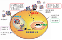 感染人类的流感病毒的靶细胞主要是呼吸道黏膜上皮细胞[8]。流感病毒首先通过病毒表面的HA蛋白与宿主上、下呼吸道或肺泡上皮细胞的唾液酸(SAs)结合,然后病毒体进入宿主细胞内质网系统,与内质网解离后释放病毒核糖核蛋白复合体(vRNP),通过细胞质运输到宿主细胞核。病毒RNA通过宿主细胞翻译系统合成流感病毒的蛋白和RNA,在宿主细胞膜组装成新的病毒体,通过出芽、剪切、释放等过程,形成新的病毒体[1,9]。在流感病毒感染过程中的不同环节,均有药物的作用靶点,见图1。