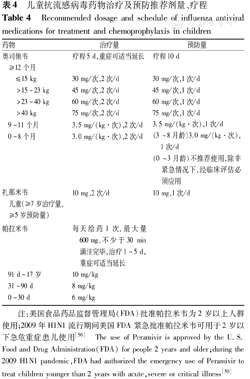 目前我国批准上市的是奥司他韦颗粒及胶囊剂、扎那米韦吸入剂和帕拉米韦注射液。推荐的用法和用量见表4,口服奥司他韦仍然是治疗流感的首选抗病毒药物。